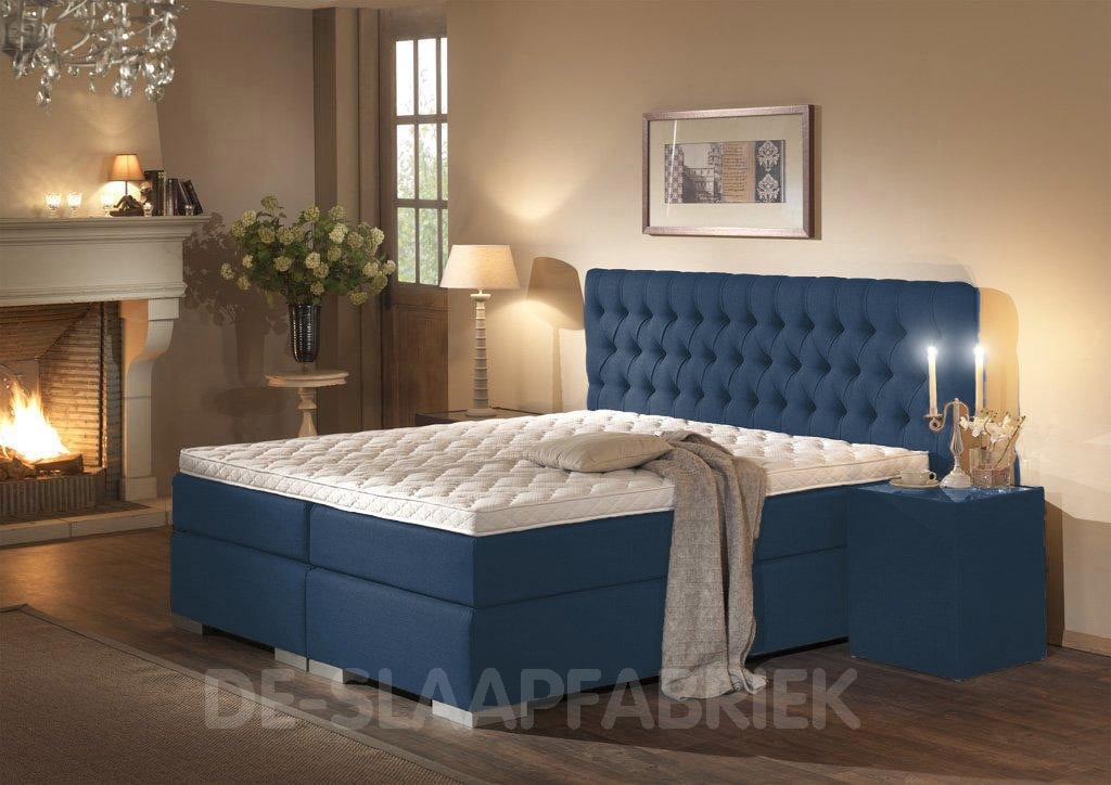 • Luxe, handmatig gecapitonneerd hoofdbord dat ongeveer even breed is als de breedte van het liggedeelte. Deze is ambachtelijk gecapitonneerd en geplooid. De hoogte van dit luxe hoofdbord is 120 cm hoog en ca. 12 cm dik.