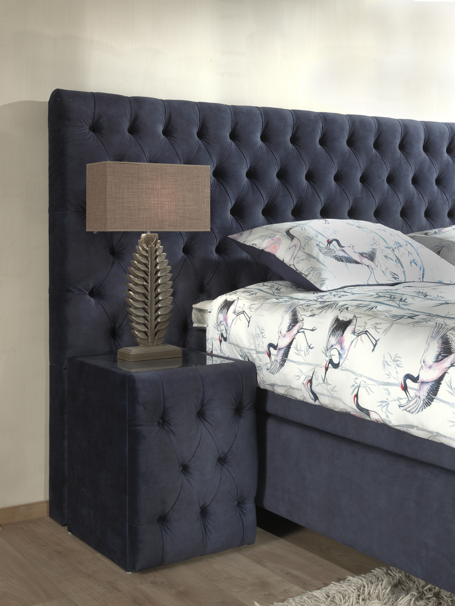 - Hoofdbord hoogte maar liefst ca. 155 cm (vanaf de grond gemeten). Standaard super oversized en daarmee ongeveer 100 cm breder dan de gekozen bedbreedte. Circa 12 cm dik. Standaard in 2 delen geleverd waardoor het hoofdbord in delen naar de slaapkamer te vervoeren is.